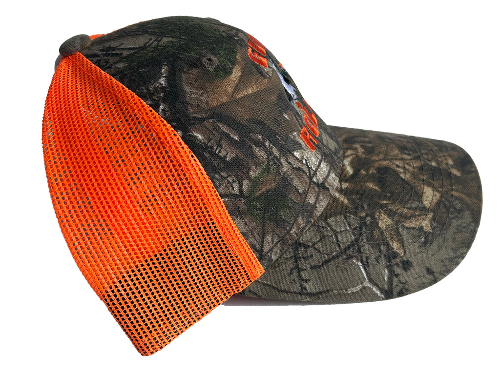 Duck Hunter Real tree orange mesh hat with adjustable velcro back closure. (Camo pattern placement vary from each hat)